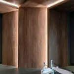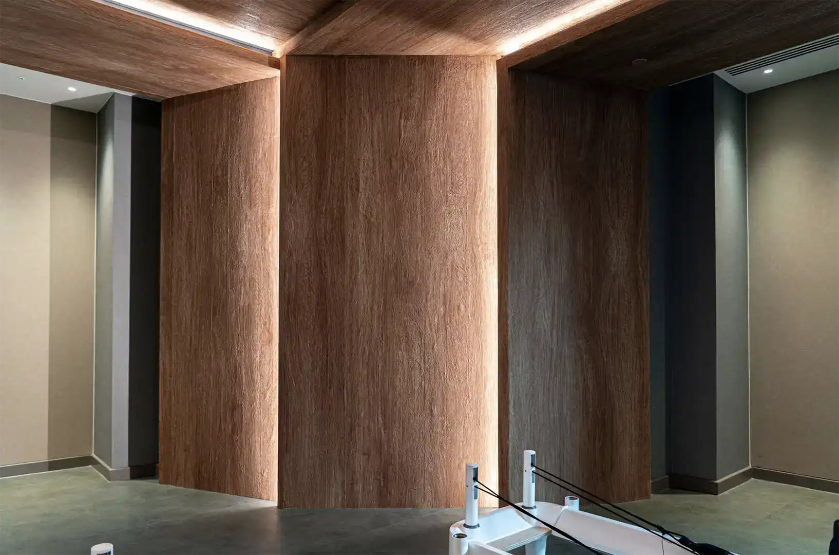 Die zu 100% aus recycelten Polyesterfasern hergestellte PET-Rückseite absorbiert die Schallenergie auf struktureller Ebene, reduziert den Nachhall und mildert die akustische Signatur eines jeden Raums. Die Japan Sugi Wood Textur fügt eine zweite Ebene hinzu: eine ruhige, kontemplative Maserung, die Rhythmus und Wärme in Wände, Decken, Büros und Gaststättenräume bringt. Der Farbton Pale Brown, ein gedämpfter Wüstensand, der durch mineralische Tiefe erwärmt wird, hält alles mit ruhigem Vertrauen zusammen.