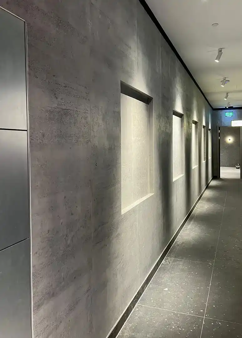 Avec seulement 2 kg/m², ce travertin gris en rouleau transforme les murs, les façades et les intérieurs sans compromis structurel – il se coupe proprement, se plie gracieusement et s’installe avec une rapidité que la pierre traditionnelle ne pourrait jamais égaler. Classement au feu A2-s1-d0. 90 % de minéraux recyclés. Convient aux pièces humides, aux environnements très fréquentés et aux spécifications architecturales les plus exigeantes.