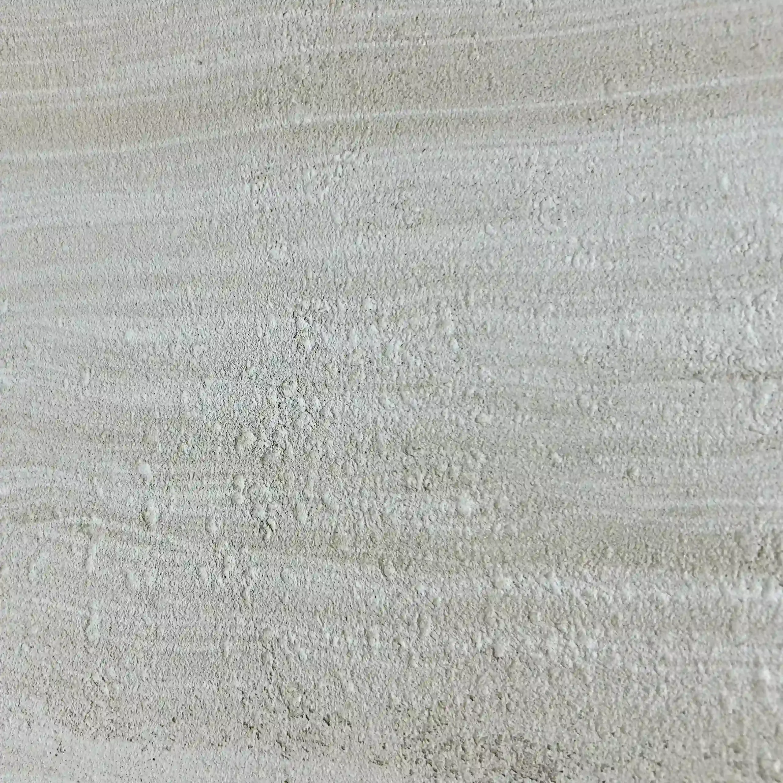 This color is a soft, chalky off-white infused with gentle sand and limestone undertones, subtly layered with fine horizontal mineral movement that gives the surface a calm, tactile depth, evoking the quiet elegance of sun-bleached stone and bringing a sense of lightness, purity and timeless architectural serenity into any space