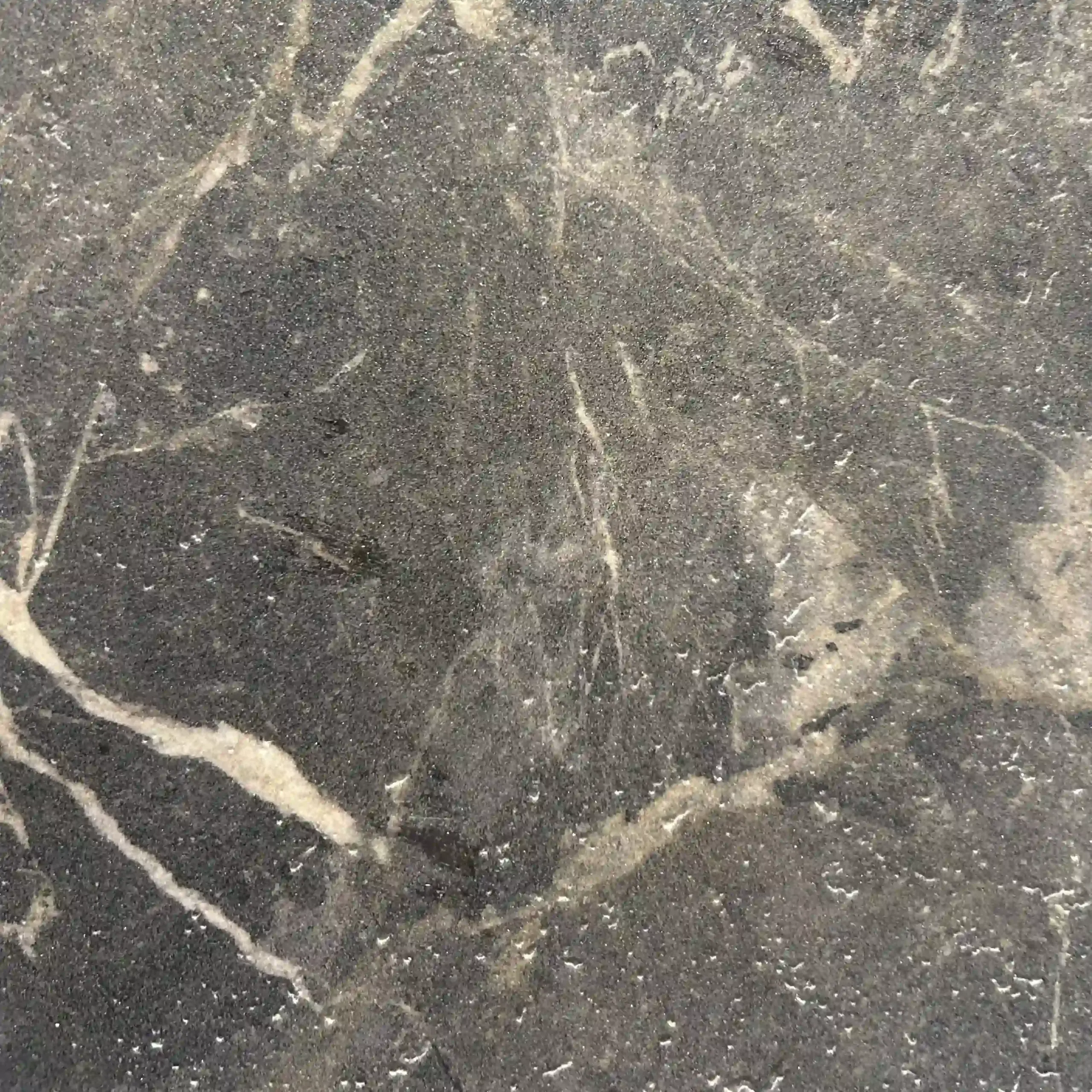 This color is a deep charcoal-slate grey infused with soft smoky undertones and traced by fine, pale mineral veins that drift across the surface like quiet lightning in stone, creating a powerful yet refined atmosphere that feels both architectural and timeless