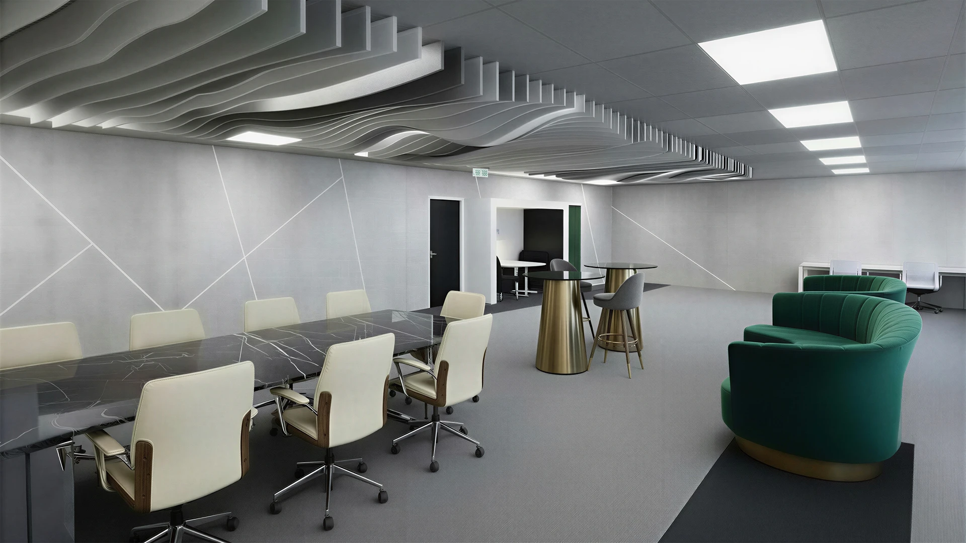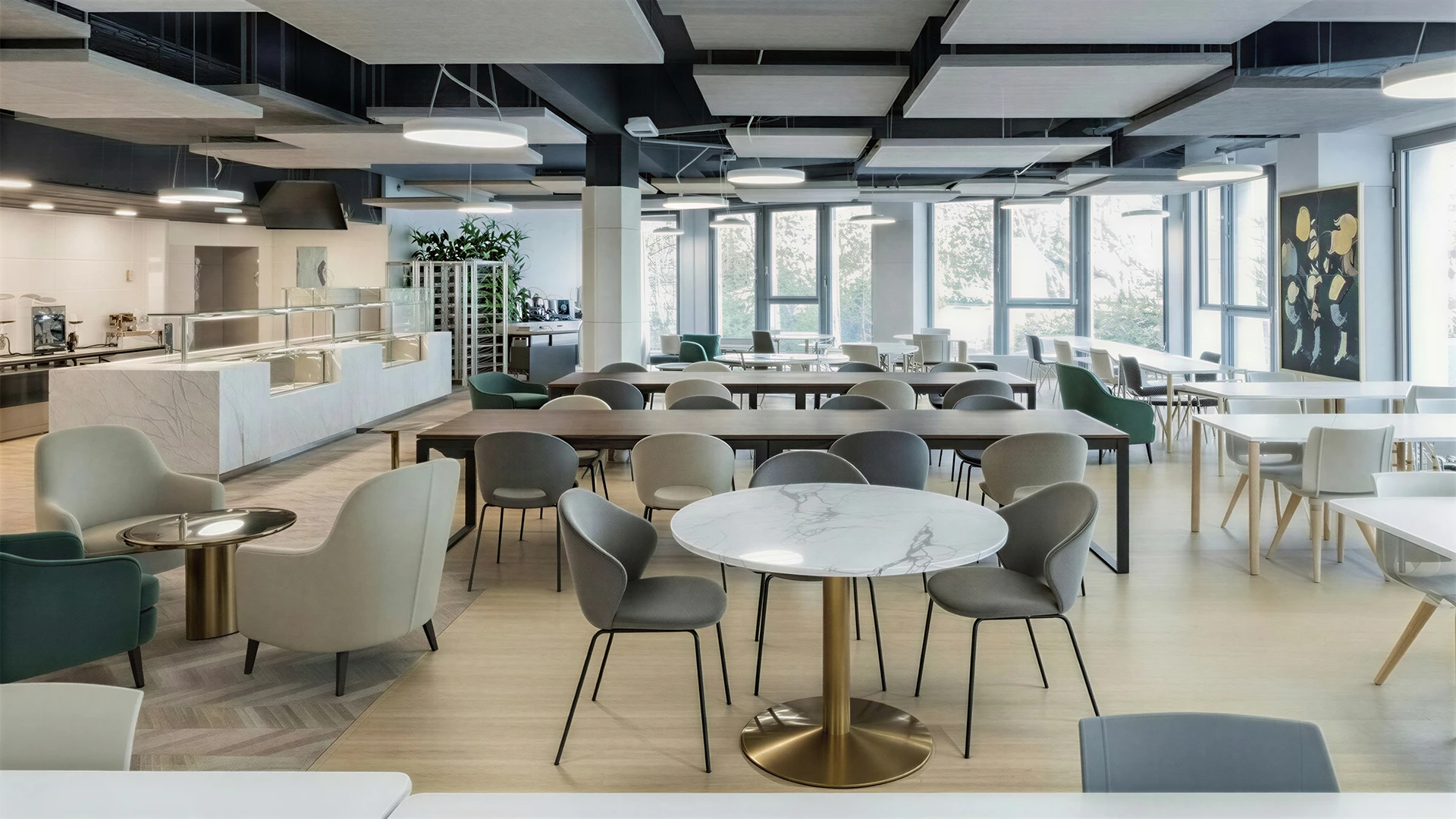 Ceiling acoustic panels reinvent space through calm. Available in a wide range of shapes and textures, they float above interiors to absorb sound, soften the atmosphere, and transform every volume into a more serene, comfortable, and harmonious experience.
