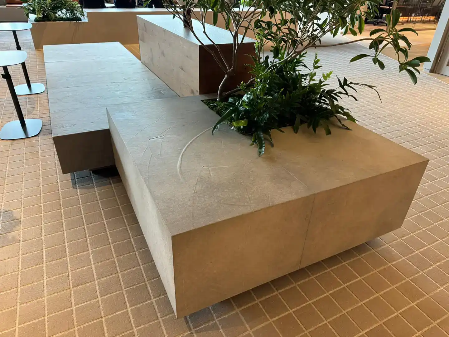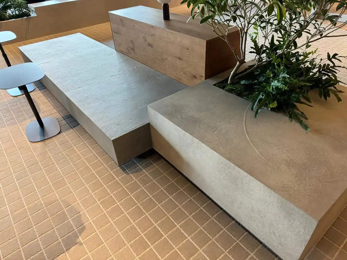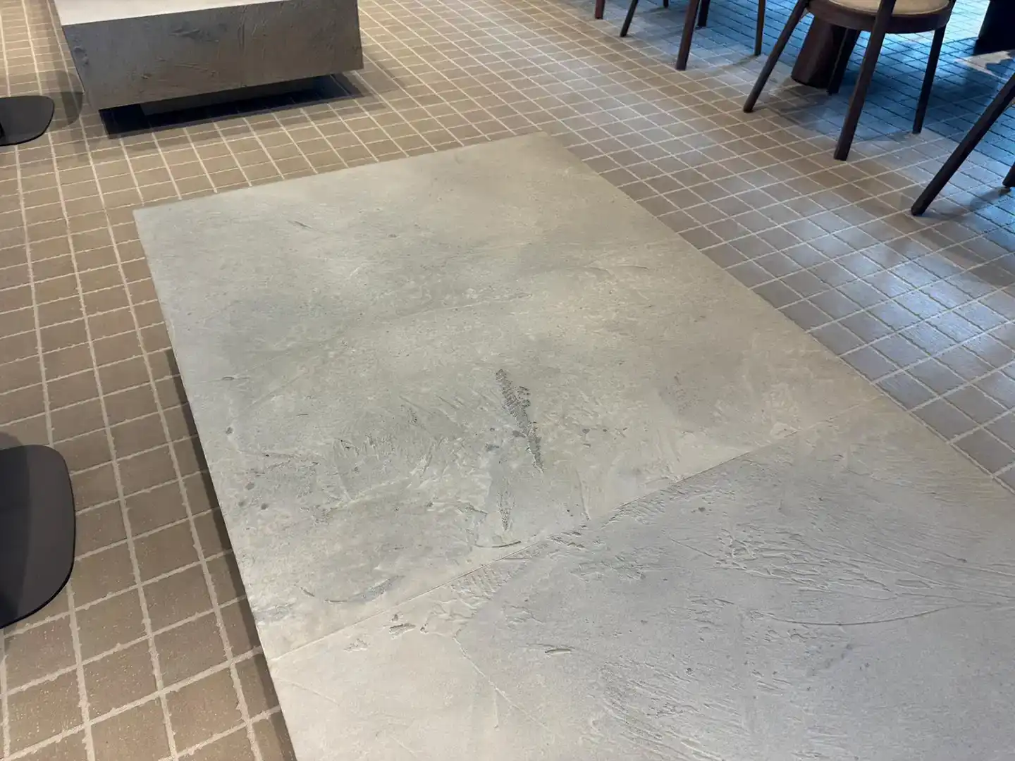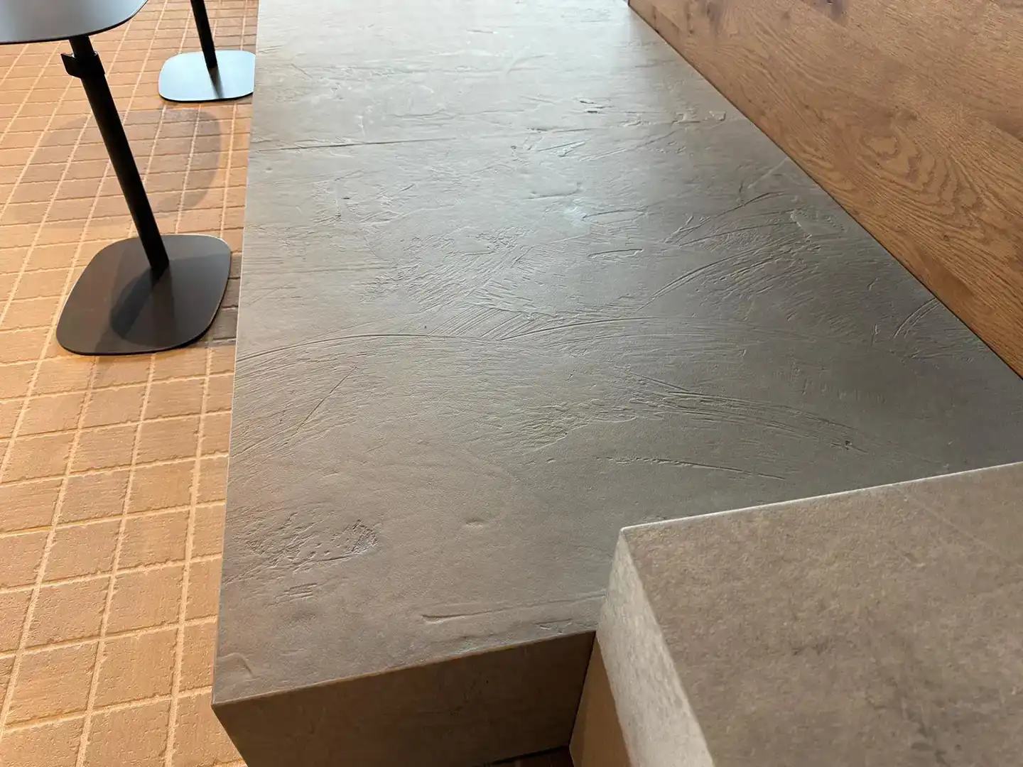 Onto this calibrated foundation, the Rough Concrete mineral veneer introduces a counterpoint of deliberate imperfection. Fine granular reliefs, subtle directional marks, and an irregular micro-texture that feels shaped by process rather than polish — honest, grounded, and quietly powerful. The kind of surface that makes a luxury retail fixture look like a considered act of design, and a bespoke furniture piece feel rooted in something real.